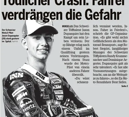 Swiss moto3 rider jason dupasquier dies in hospital from injuries he sustained in a crash during saturday's qualifying session in italy jason dupasquier. Swiss moto3 rider jason dupasquier dies in hospital from injuries he sustained in a crash during saturday's qualifying session in italy.